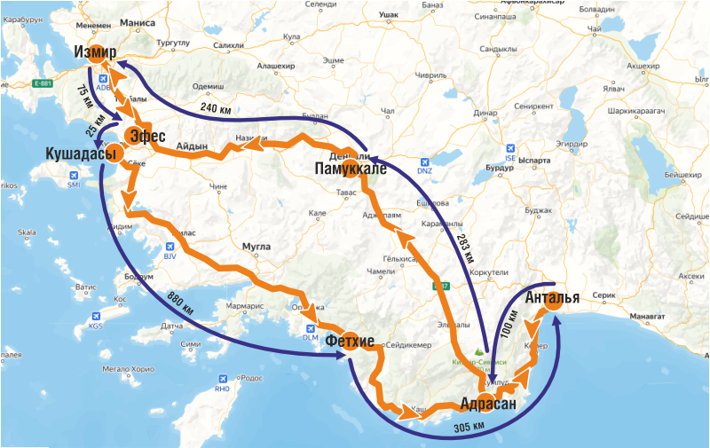 Маршрут: Анталья - Адрасан - Памуккале - Измир - Эфес - Кушадасы - Фетхие - Анталья
