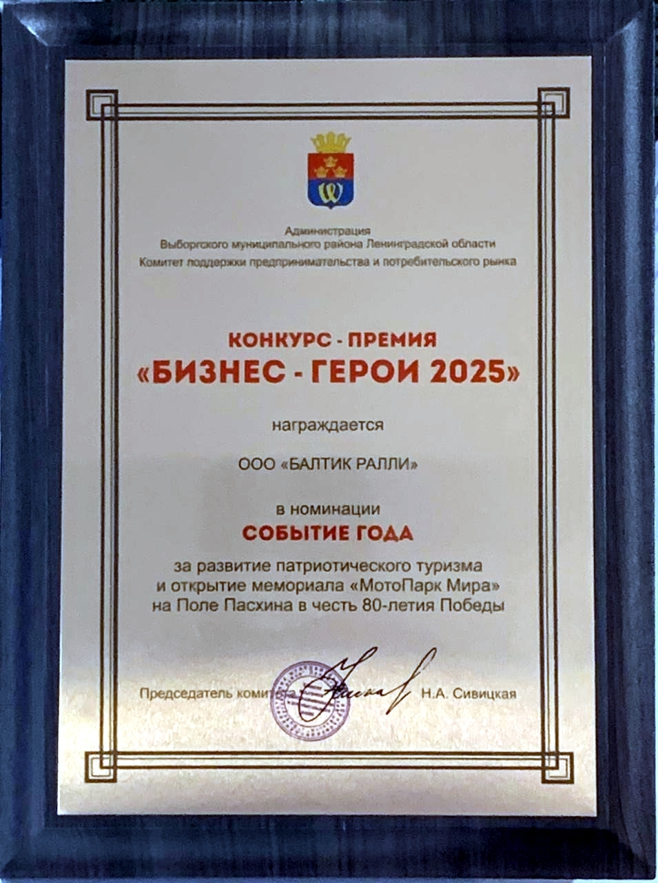 В этом году впервые была учреждена данная премия и команде мотофестиваля "Балтик Ралли" - Игорю Щербакову и Алевтине Болговой был присужден диплом за развитие патриотического туризма в номинации «Событие года» за Открытие мемориала «МотоПарк Мира» на Поле Пасхина в честь 80-летия Победы.